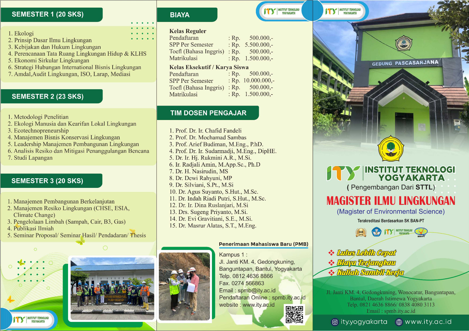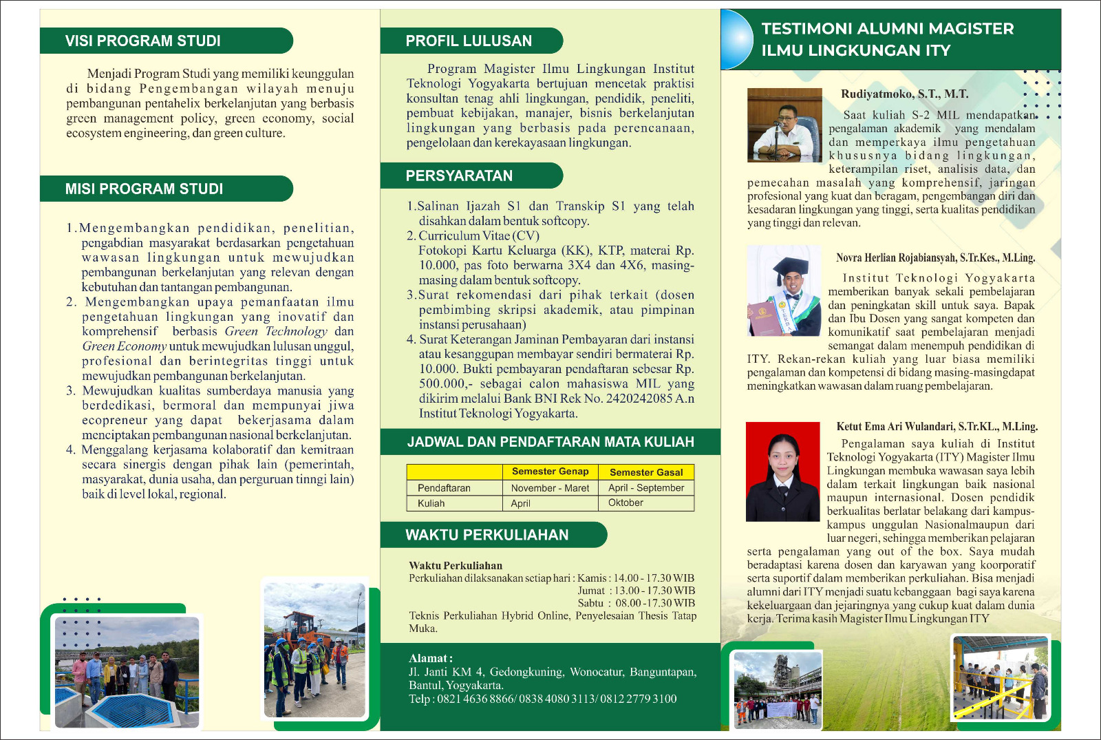 Oleh karena adanya berbagai macam dampak yang ditimbulkan dari berbagai aktivitas pembangunan di bidang sosial, ekonomi, budaya, pendidikan dll. Peran program studi Magister Ilmu Lingkungan menjadi salah satu ilmu yang sangat diperlukan bagi pencapaian pengelolaan pembangunan berkelanjutan melalui keunggulan Green economy pada Program Studi Magister Ilmu Lingkungan Institut Teknologi Yogyakarta. Prodi Magister Ilmu Lingkungan ini memiliki output ketercapaian pembelajaran yaitu “Pengelolaan Strategis Konservasi SDA dan Lingkungan yang berbasis Ekonomi Hijau”