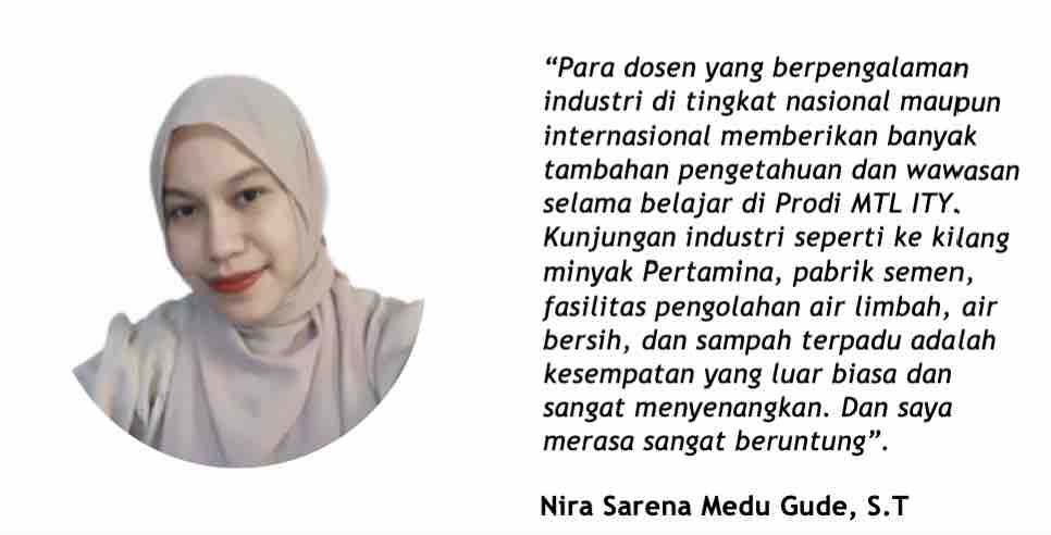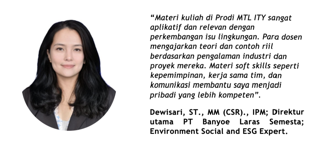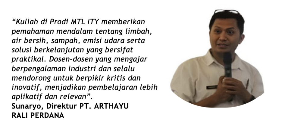 1.Lulusan Prodi MTL ITY diharapkan memiliki tanggung jawab dan kemampuan untuk melindungi serta mengelola kualitas dan keberlanjutan (sustainability) dari udara, air, tanah, energi dan sumber daya alam lainnya.