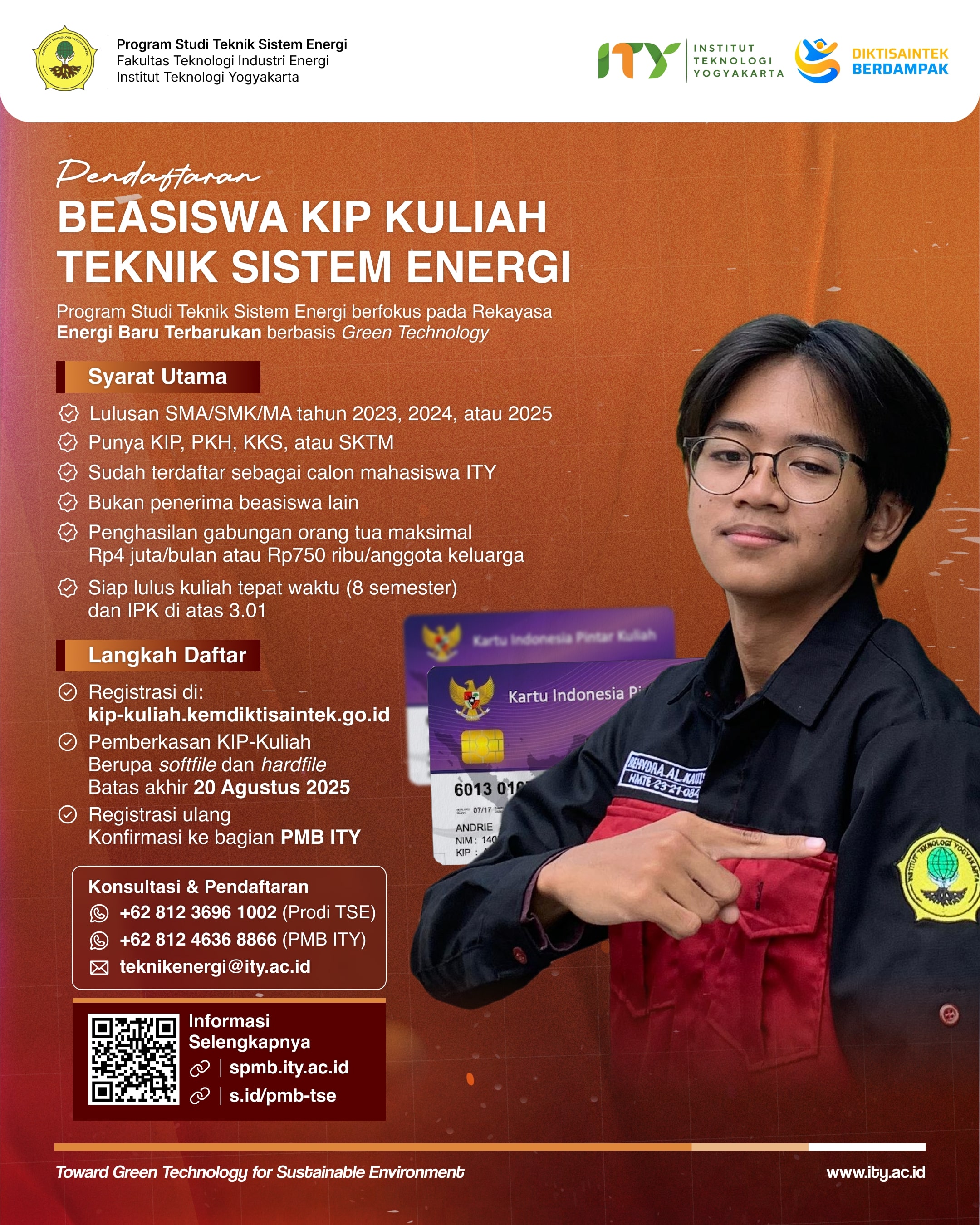Program Studi Teknik Sistem Energi Institut Teknologi Yogyakarta membuka pendaftaran Beasiswa KIP Kuliah Tahun 2025 bagi lulusan SMA/SMK/MA tahun 2023, 2024, dan 2025. Beasiswa ini ditujukan bagi calon mahasiswa berprestasi yang memiliki keterbatasan ekonomi untuk menempuh pendidikan tinggi di bidang Rekayasa Energi Baru Terbarukan berbasis Green Technology.